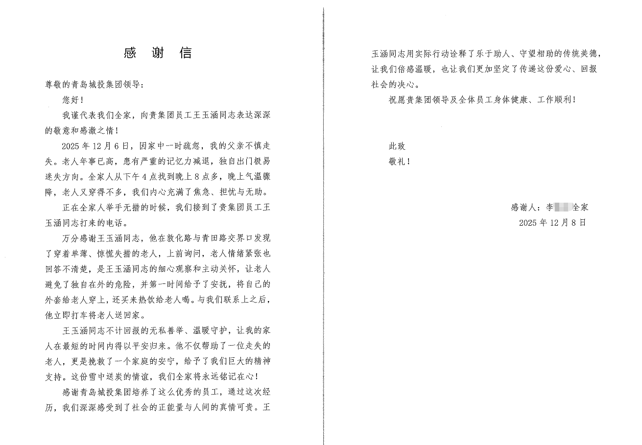 “王玉涵同志不计回报的善举,让我们家在最短时间内得以平安归来。他不仅帮助了一位走失的老人,更是挽救了一个家庭的安宁。感谢青岛城投集团培养了这么优秀的员工”家属在感谢信中动情地写道。