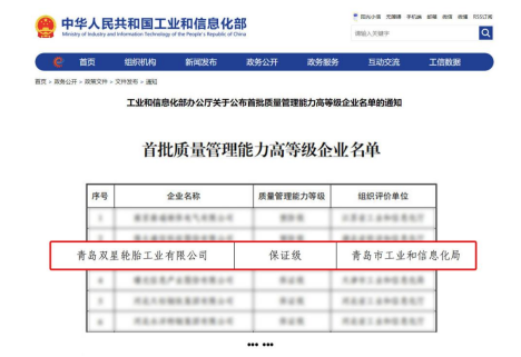 双星轮胎被国家工信部评为“质量管理能力高等级企业”,成为轮胎行业唯一入选企业。
