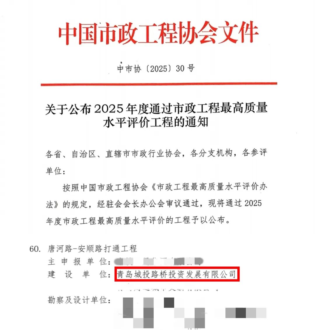 唐河路-安顺路打通工程被中国市政工程协会评为2025年度市政工程最高质量水平评价工程