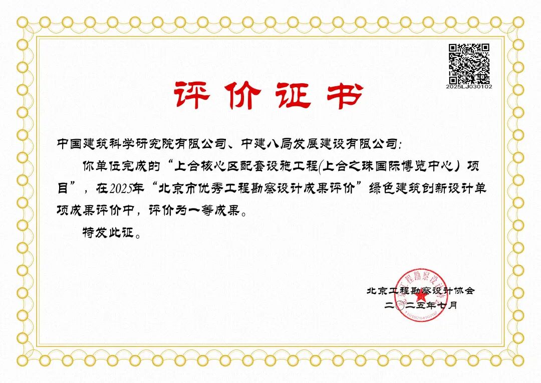 上合之珠国际博览中心项目在2025年“北京市优秀工程勘察设计成果评价”绿色建筑创新设计单项成果评价中,评价为一等成果
