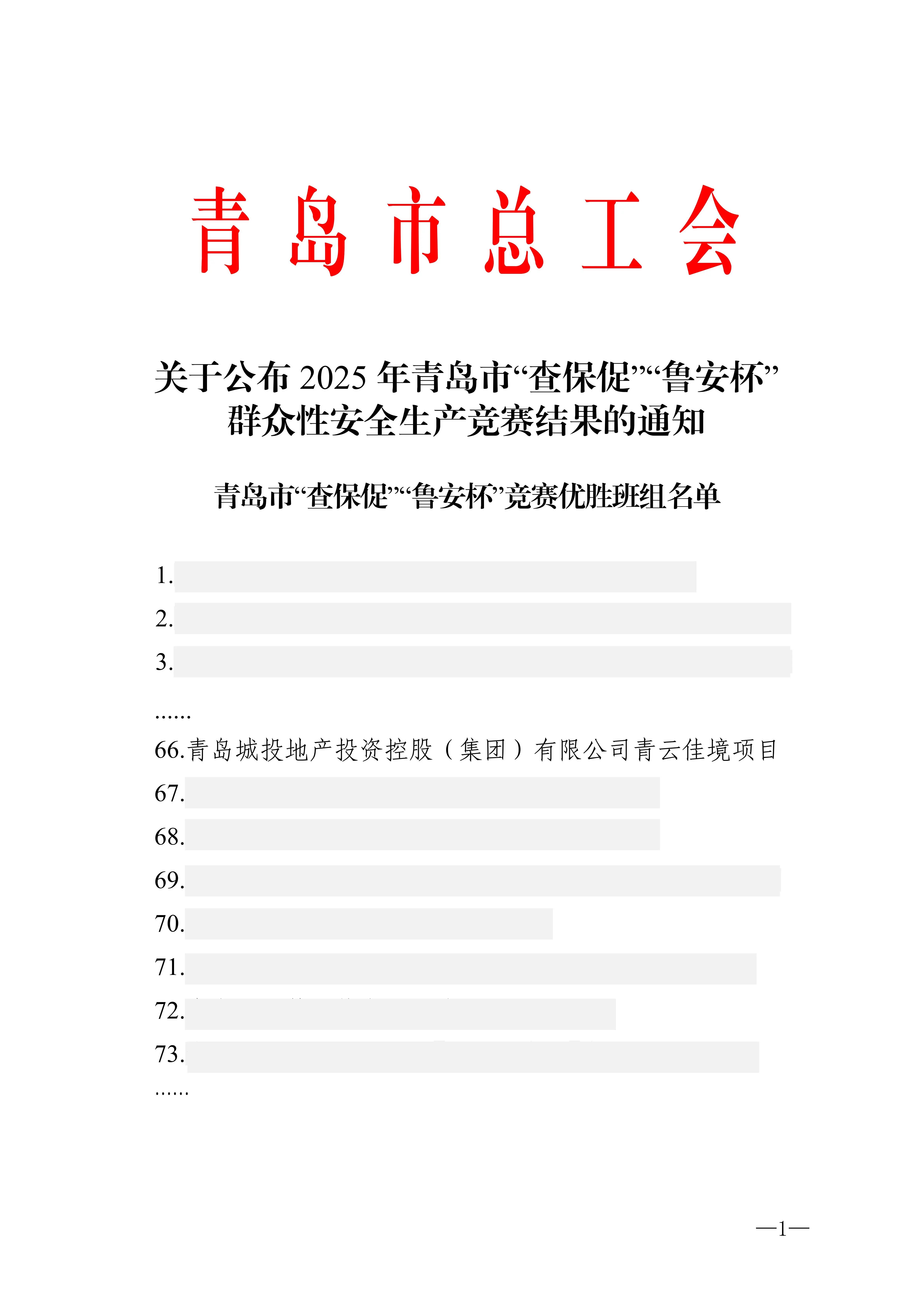 青云佳境项目班组被青岛市总工会评为“查保促”“鲁安杯”竞赛优胜班组