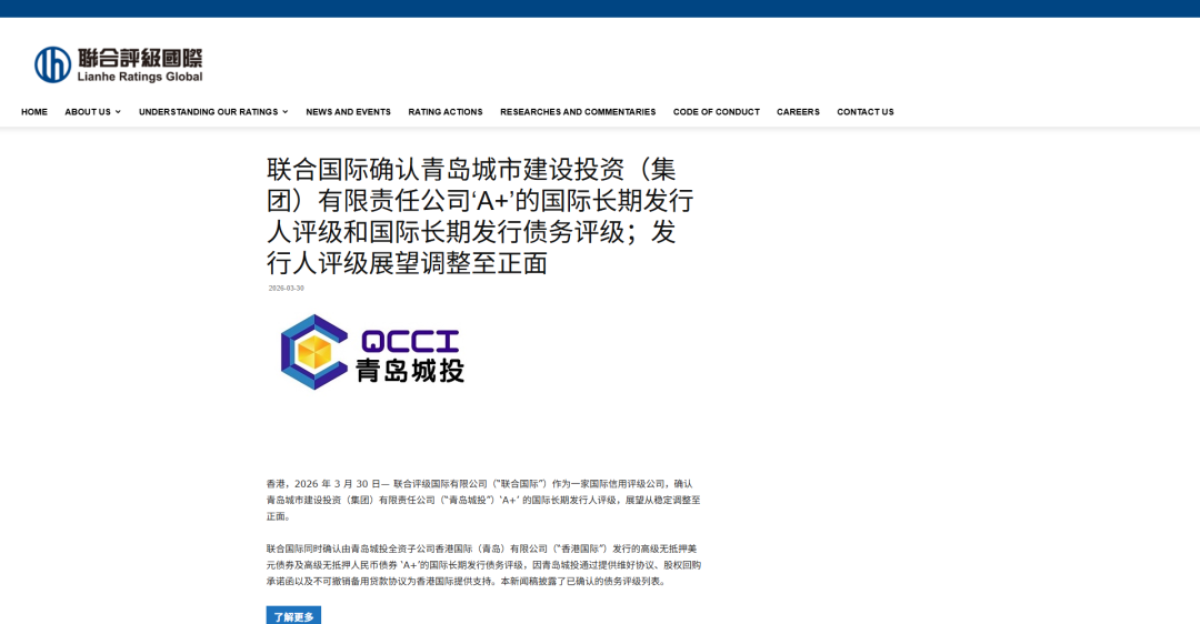 3月30日,联合评级国际有限公司(“联合国际”)发布公告,确认青岛城市建设投资(集团)有限责任公司"A+"的国际长期发行人评级,同时将评级展望从稳定调整至正面。