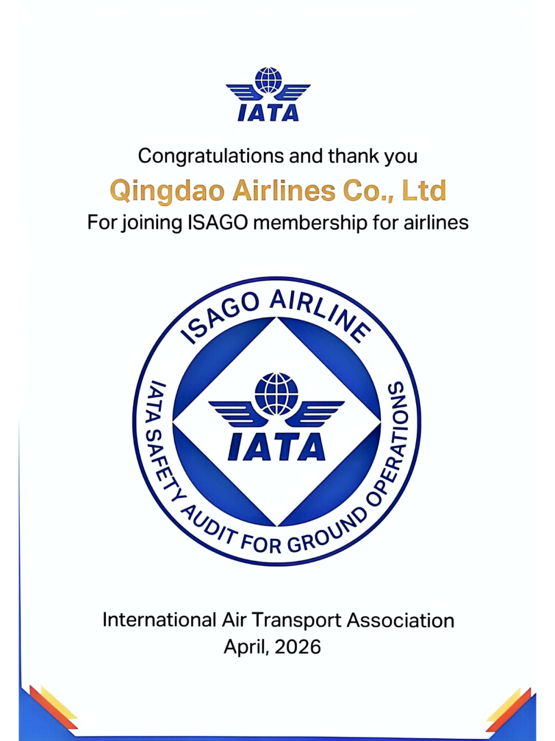 近日,国际航空协会(IATA)向青岛航空颁发ISAGO航空公司会员证书,标志着青岛航空正式成为国际航协ISAGO航空公司会员,将推动外站业务与代理监管对标国际一流标准,全面提升境外站点安全管控质效,实现监管模式与国际接轨。